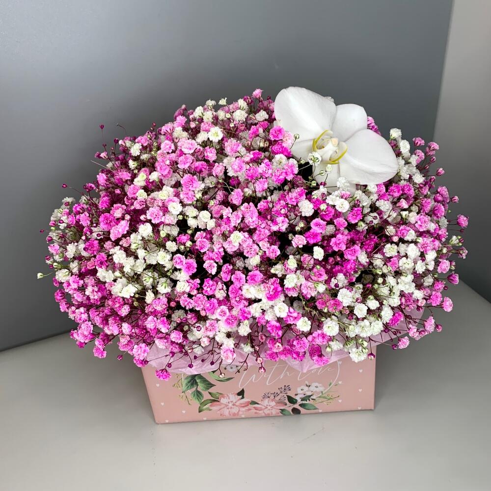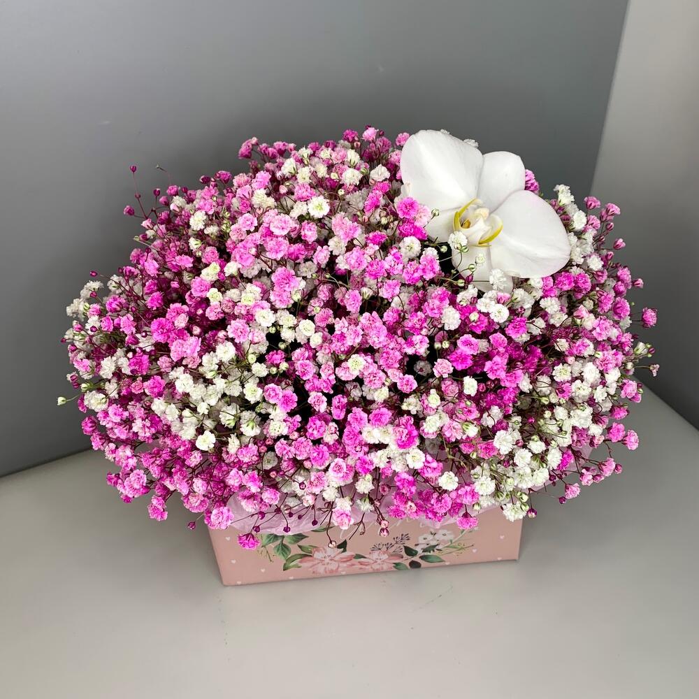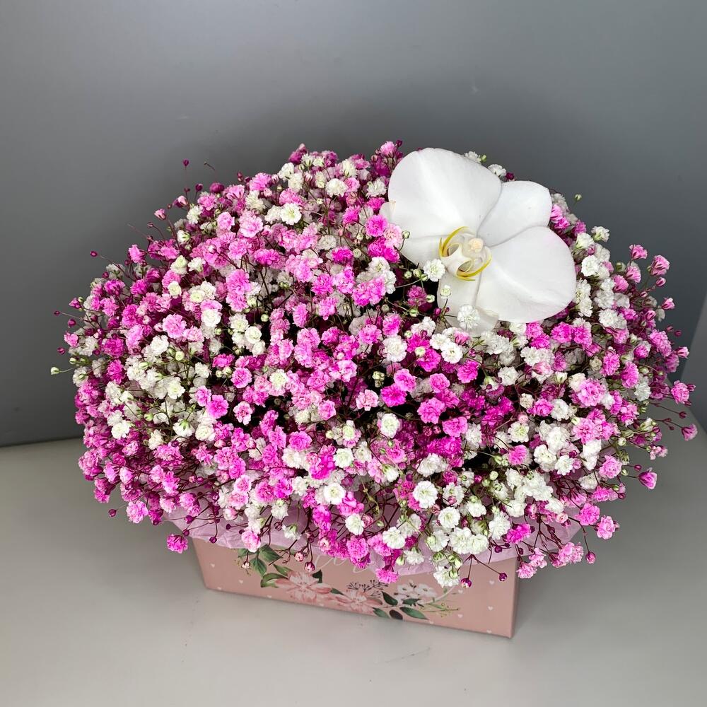 гипсофила радужная – 6 шт.орхидея фаленопсис цветок – 1 шт.Коробка – 1 шт.Тишью – 2 шт.Оазис флористический – 1 шт.Пленка прозрачная – 1 шт.Лента атласная – 2 шт.