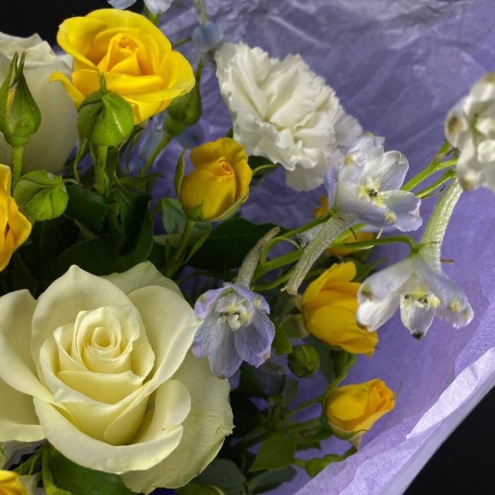 Альстромерия – 3 шт.Роза одноголовая – 3 шт.Роза кустовая желтая – 3 шт.Гвоздика одноголовая – 4 шт.Дельфиниум синий – 2 шт.фисташка зелень – 2 шт.
