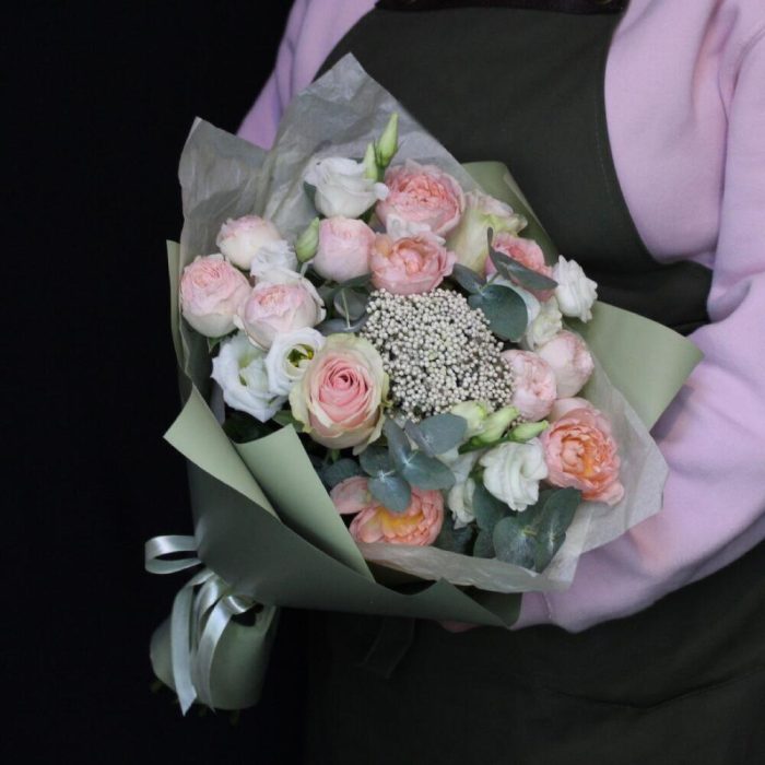 роза эквадор фруттето – 2 шт.Роза кустовая пионовидная джульетта – 1 шт.роза кустовая пионовидная мансфилд парк – 2 шт.Озотамнус – 1 шт.Эвкалипт – 1 шт.Эустома – 2 шт.Тишью – 1 шт.Пленка дизайнерская – 2 шт.