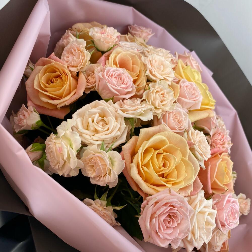 Кустовая роза – 19 шт.Одноголовая роза – 10 шт.Упаковка дизайнерская – 3 шт.Атласная лента – 1 шт.