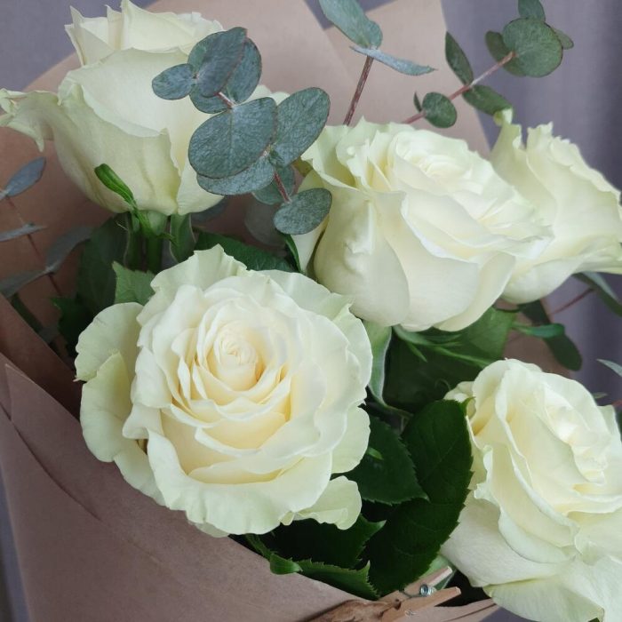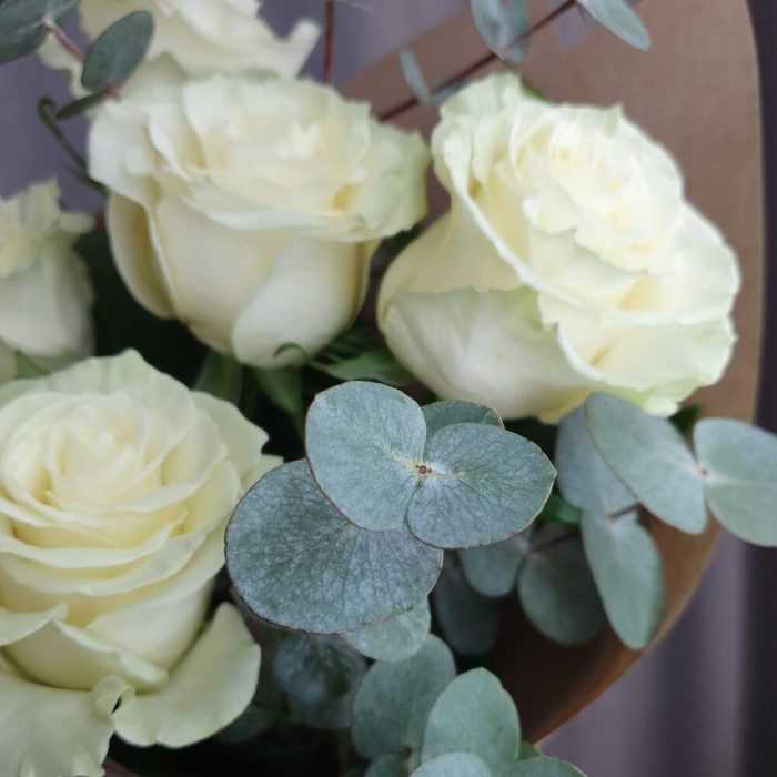 Букет из белых роз с эвкалиптом