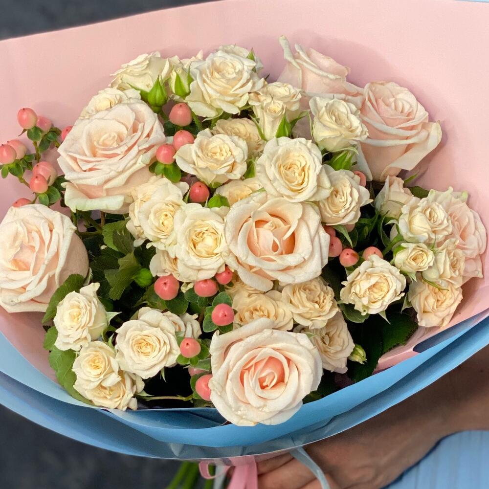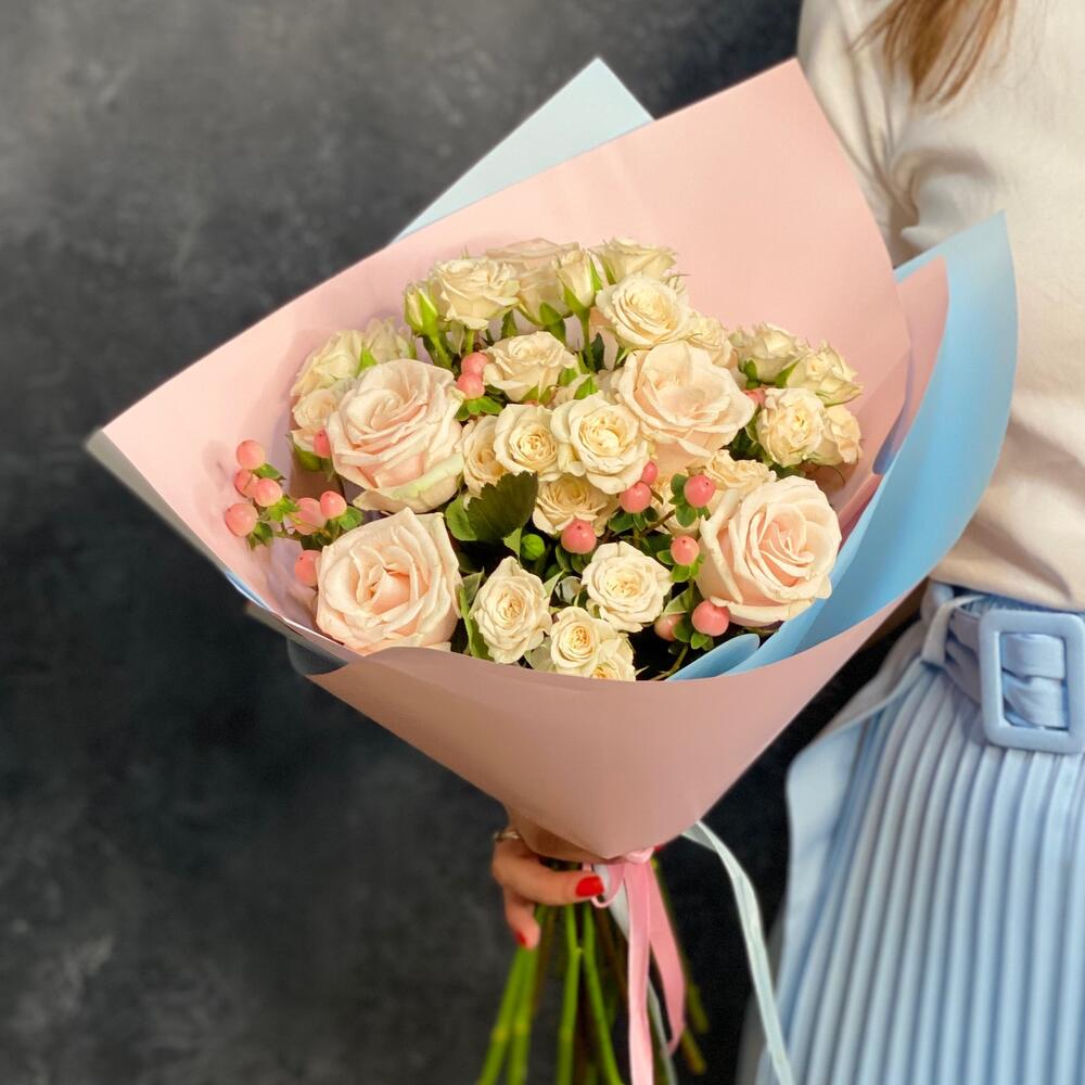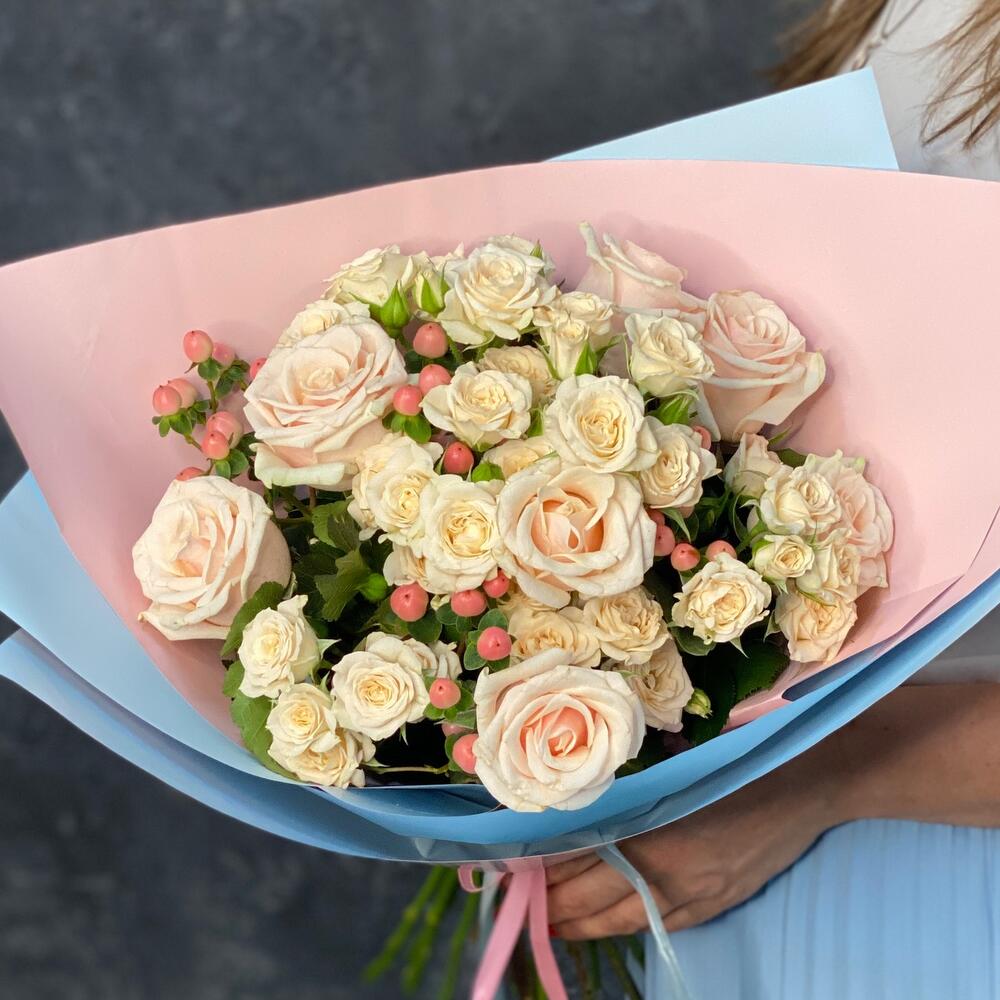 Лента атласная – 2 шт.Упаковка дизайнерская – 1 шт.Гиперикум розовый – 4 шт.Роза Талея 50 см – 7 шт.роза кустовая кремовая грация – 6 шт.
