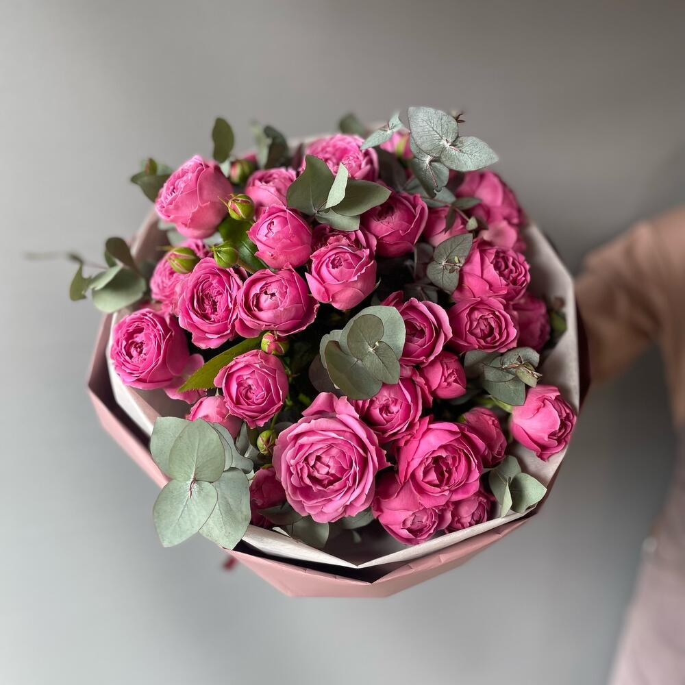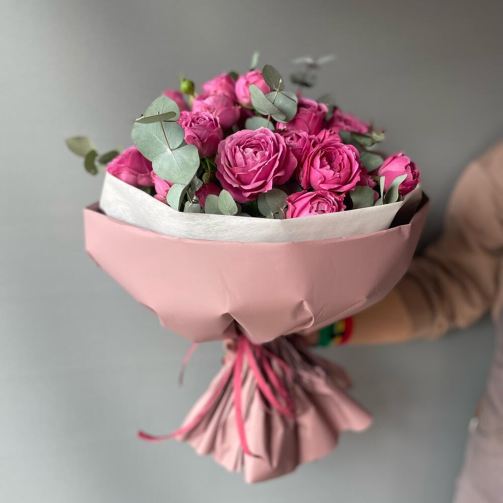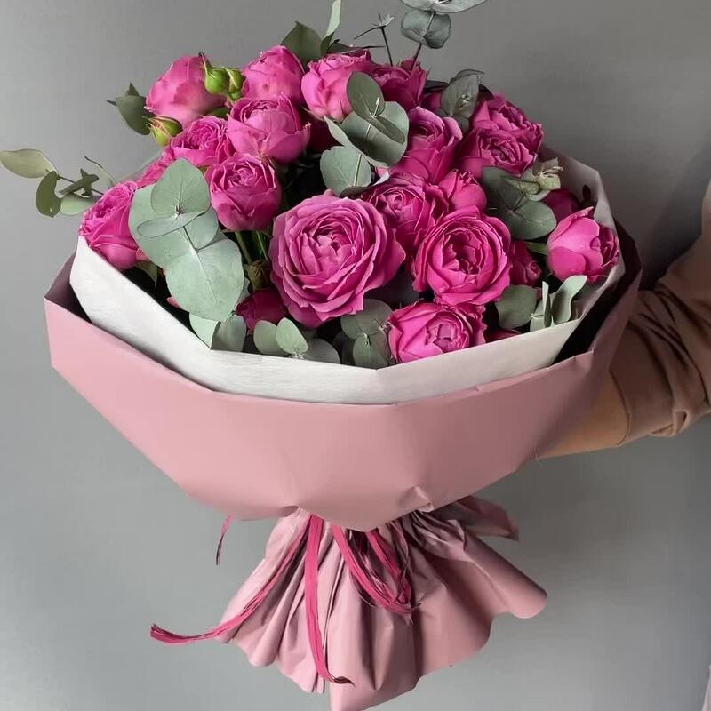 Эвкалипт – 5 шт.Роза пионовидная кустовая – 9 шт.Упаковка дизайнерская – 2 шт.