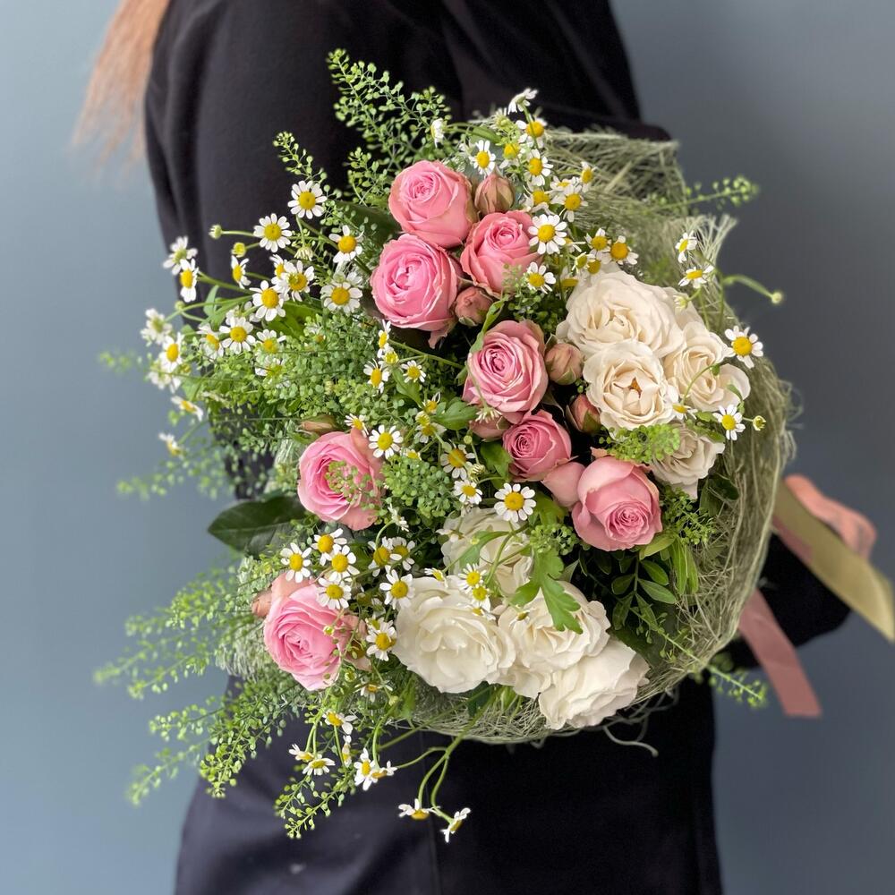 Лента – 1 шт.Роза кустовая – 5 шт.Матрикария – 4 шт.Мешковина – 1 шт.зелень декоративная – 2 шт.