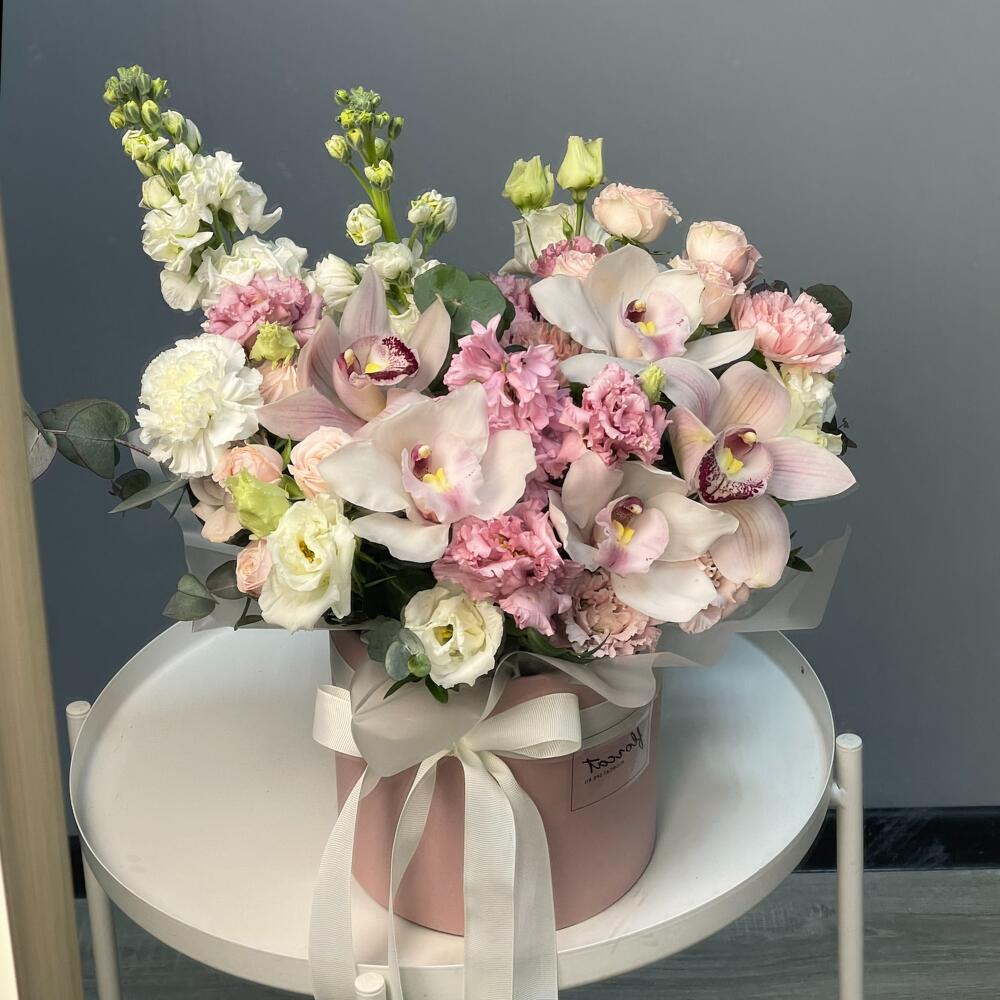 Букет в шляпной коробке с орхидеей