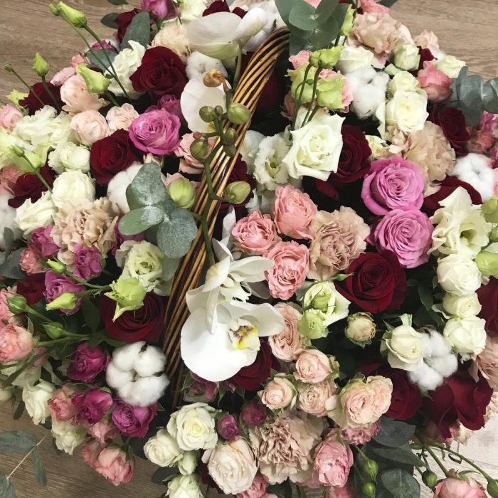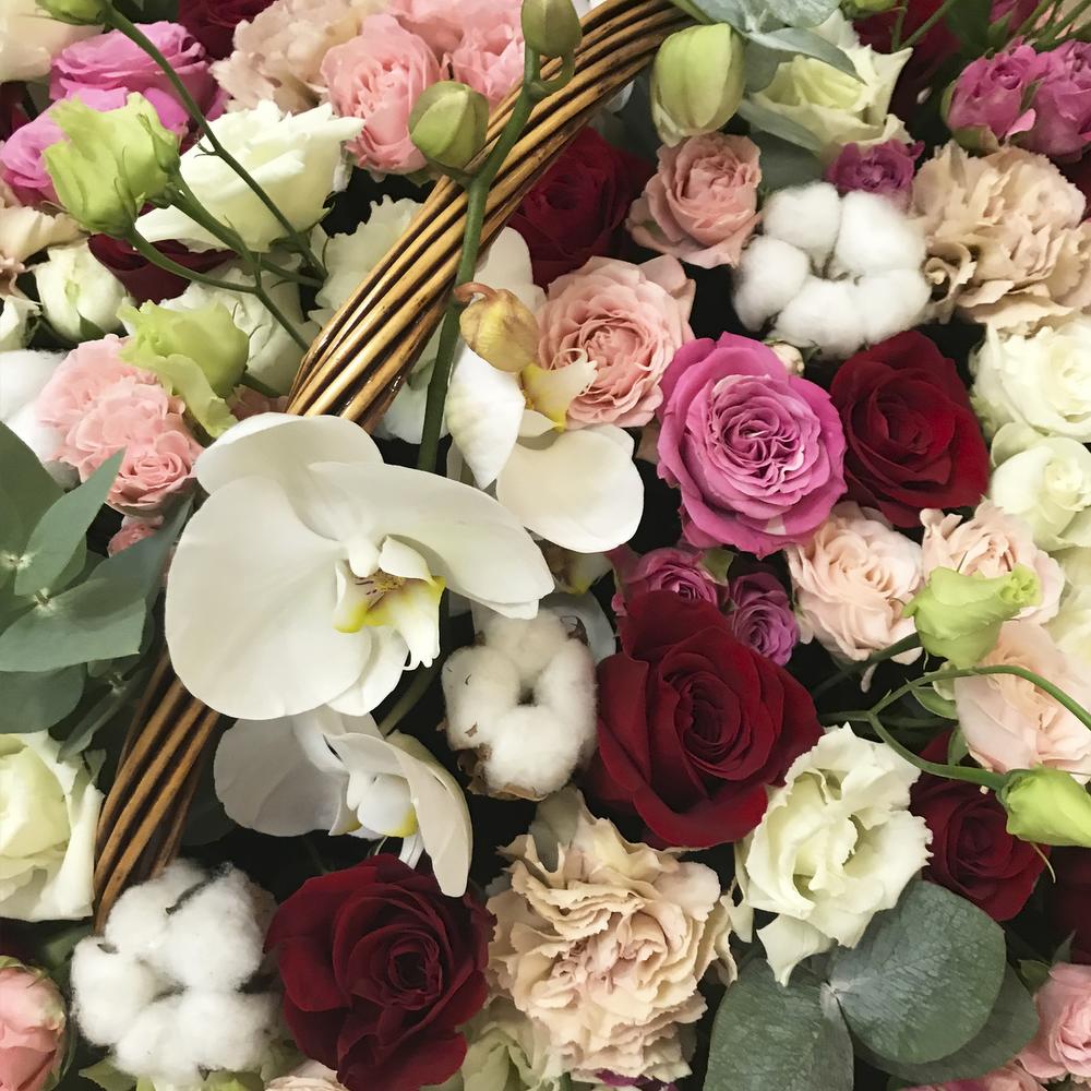 роза премиум эквадор – 25 шт.Диантус – 20 шт.Эвкалипт – 15 шт.Хлопок натуральный – 12 шт.роза кустовая “мисс бомбастик” – 10 шт.роза кустовая “бомбастик” – 10 шт.роза кустовая “мадам бомбастик” – 10 шт.роза кустовая “леди бомбастик” – 10 шт.эустома “алиса вайт” – 10 шт.орхидея “фаленопсис” – 2 шт.Оазис флористический – 4 шт.Корзина плетеная – 1 шт.