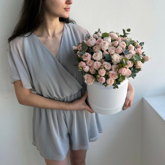Шляпная коробка розовых пионовидных кустовых роз (N 162)