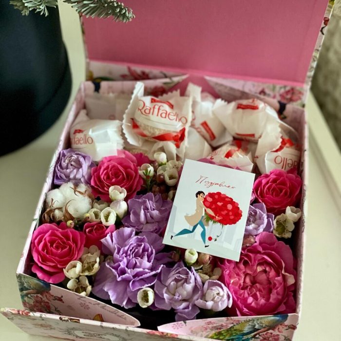 Кустовая роза – 4 шт.Зелень – 1 шт.Раффаэлло – 100 гр.Хризантема – 3 шт.Гвоздика – 3 шт.Эустома – 1 шт.Оазис – 1 шт.Коробка – 1 шт.