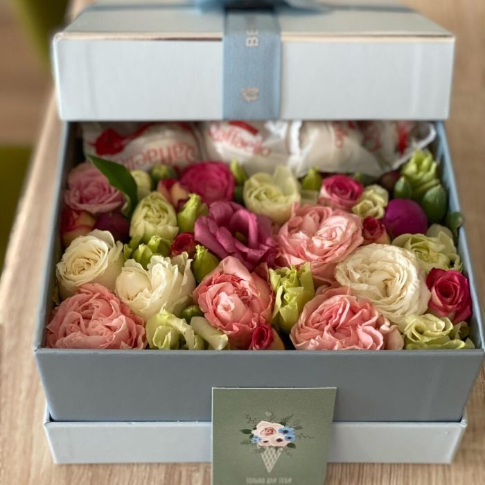 “Сладкое сердце ” – цветочная композиция с сладостями в коробке “Сердце”