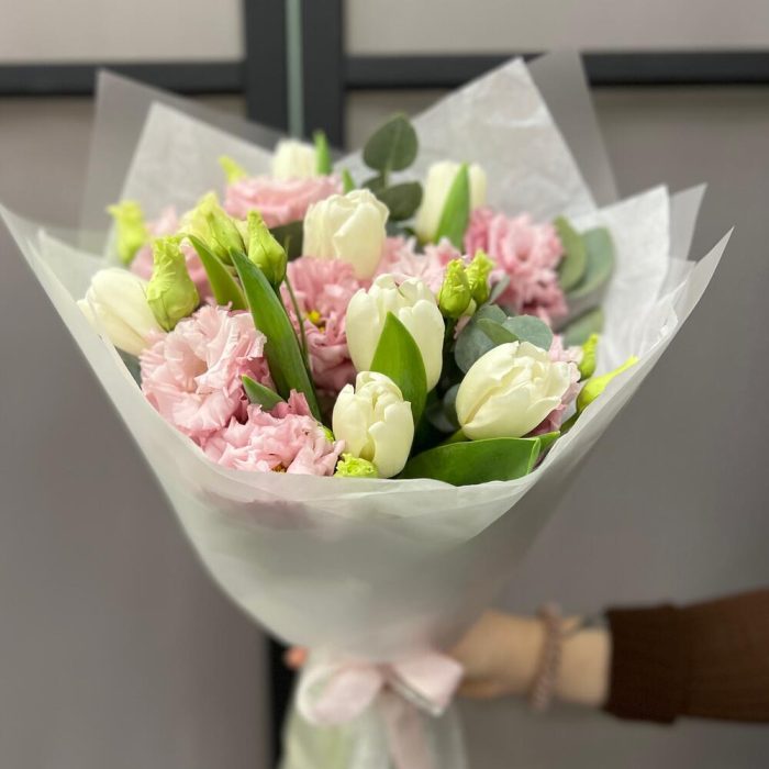 Тюльпан белый – 7 шт.эустома розовая махровая – 3 шт.Эвкалипт – 1 шт.Тишью – 1 шт.Пленка матовая – 2 шт.Лента атласная – 2 шт.